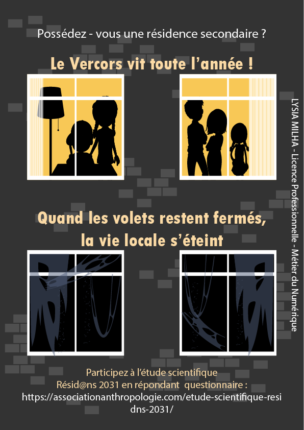 Création d’une affiche visant à inciter les propriétaires de résidences secondaires du Vercors à répondre à la dernière vague de l’étude RESID@NS 2031, portant sur la crise du logement et l’habitabilité dans un territoire en tension. Ce projet m’a permis de travailler la communication ciblée et l’adaptation des contenus à un public spécifique